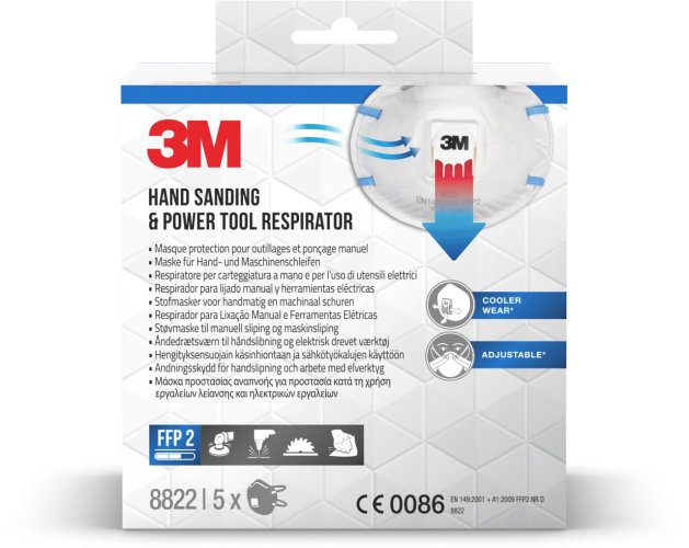 Die 3M™ Partikelmaske 8822 verstauen Sie am besten in Ihrem Werkzeugschrank, denn Sie benötigen sie bei Arbeiten mit Elektrowerkzeugen wie zum Beispiel Schleifen, Bohren oder Sägen. Darüber hinaus empfiehlt sie sich bei der Schimmelentfernung (Sporen Risikogruppe 2). Sie ist nicht für giftige Substanzen wie Dämmwolle und Stäube von Hartholz oder bleihaltigen Farben geeignet. Die Maske lässt sich dank ihres vorgeformten Körpers schnell und unkompliziert aufsetzen. Ihr flexibler Nasenbügel passt sich optimal an jede Gesichtsform an. Zusätzliches Plus: Die 3M™ Cool Flow™ Ventiltechnik erhöht den Komfort und erleichtert das Ausströmen der warmen, feuchten Atemluft aus der Maske. Das Produkt entspricht der Schutzstufe FFP2 und erfüllt die Sicherheitsanforderungen der Europäischen Norm EN 149:2001 + A1:2009 FFP1 NR D. Lieferumfang: 5 Stück pro Verkaufseinheit. Gemäss WHO Empfehlung ist der Virenschutz mit dieser Maske gewährleistet.