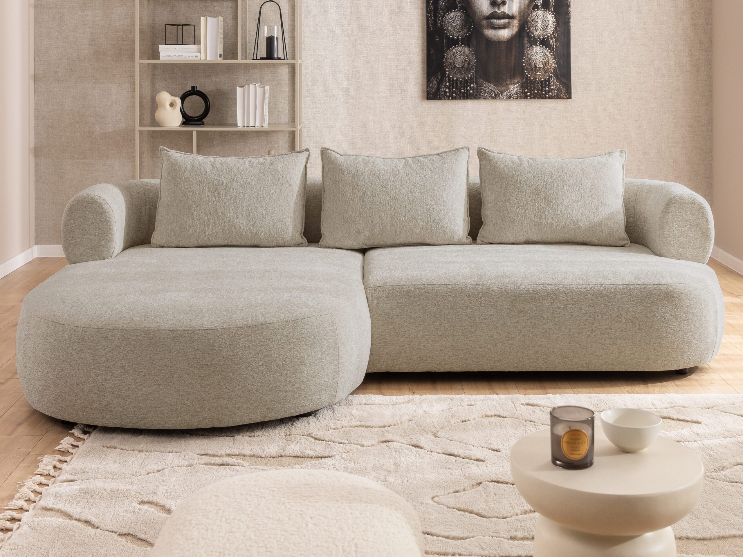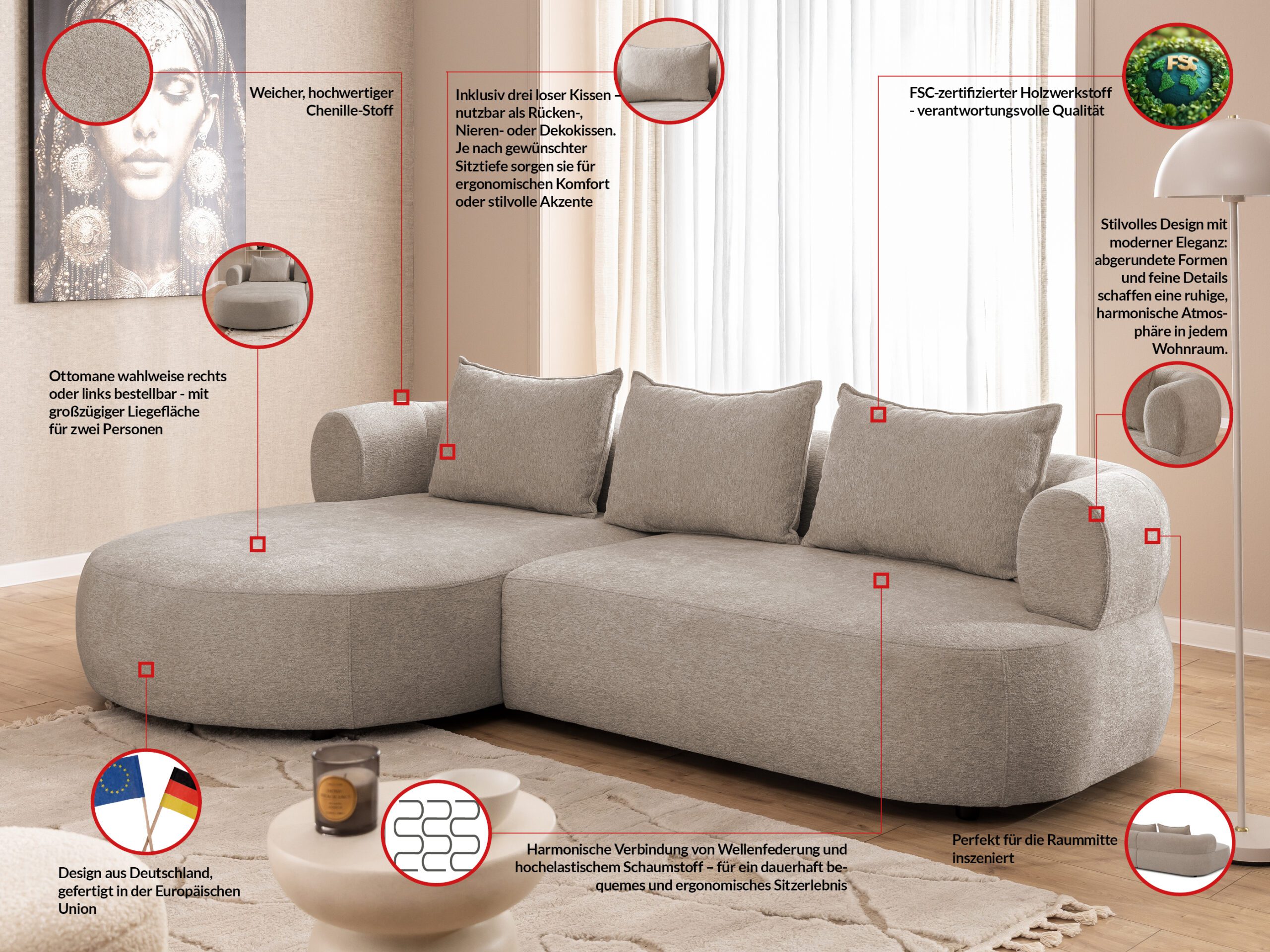Das Ecksofa Dublin bietet hohen Sitzkomfort dank stabiler Wellenfederung und hochelastischem Polyurethanschaum, der formstabil bleibt und sich angenehm an den Körper anpasst. Die losen Rückenkissen, gefüllt mit Schaumstoff und Silikon, sorgen für ein weiches und entspanntes Anlehnen.