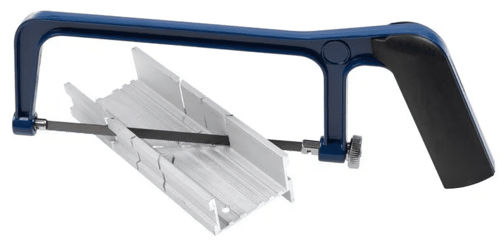 Gehrungshandsäge mit einer 140 mm langen Klinge auf einem weißen Hintergrund. Kompakte Metallsäge mit einer Aluminium-Schnittführung, ebenfalls auf einem weißen Hintergrund.